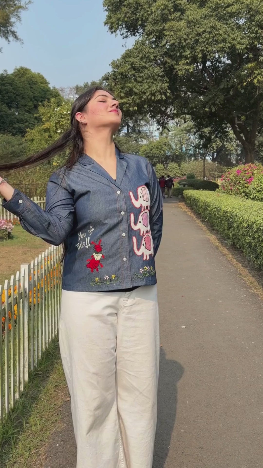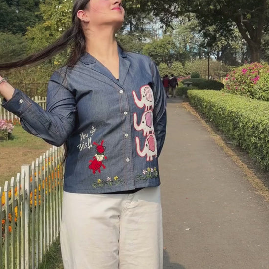 Designed for effortless casual wear for women, the shirt is detailed with a playful elephant appliqué on one side and an ant motif flexing its arms on the other, finished with the embroidered affirmation “you’ve got it.” Equal parts comfortable and expressive, this denim shirt brings character, confidence, and versatility to modern women’s dressing.