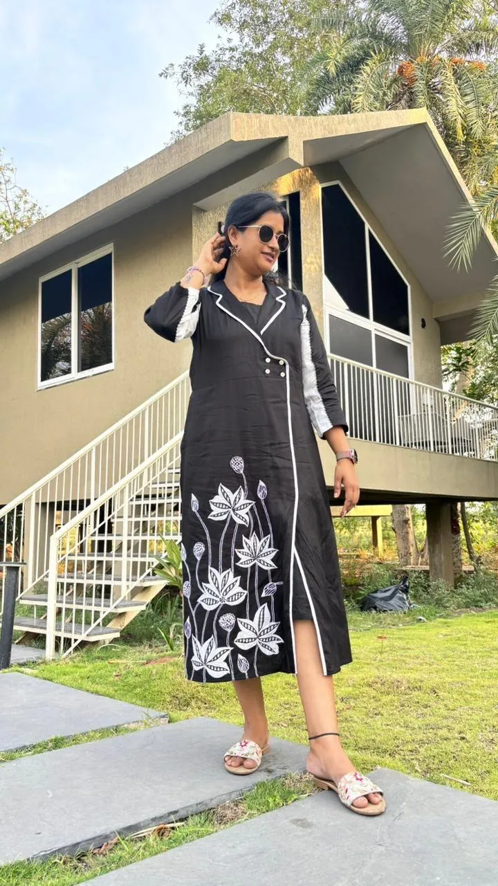 Pure cotton dress with pockets. Features a lapel collar and front opening with a detachable slip inside. Adorned with white and checks applique embroidery.
