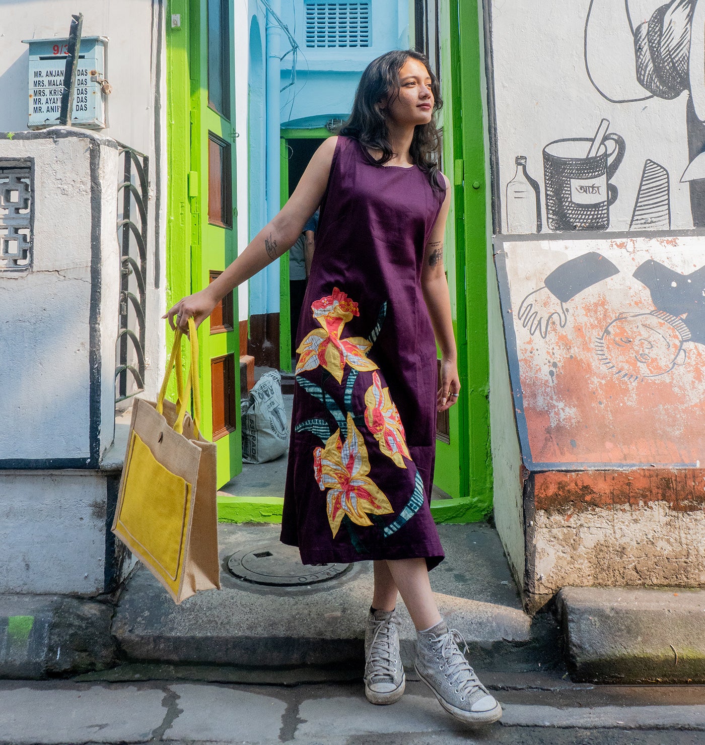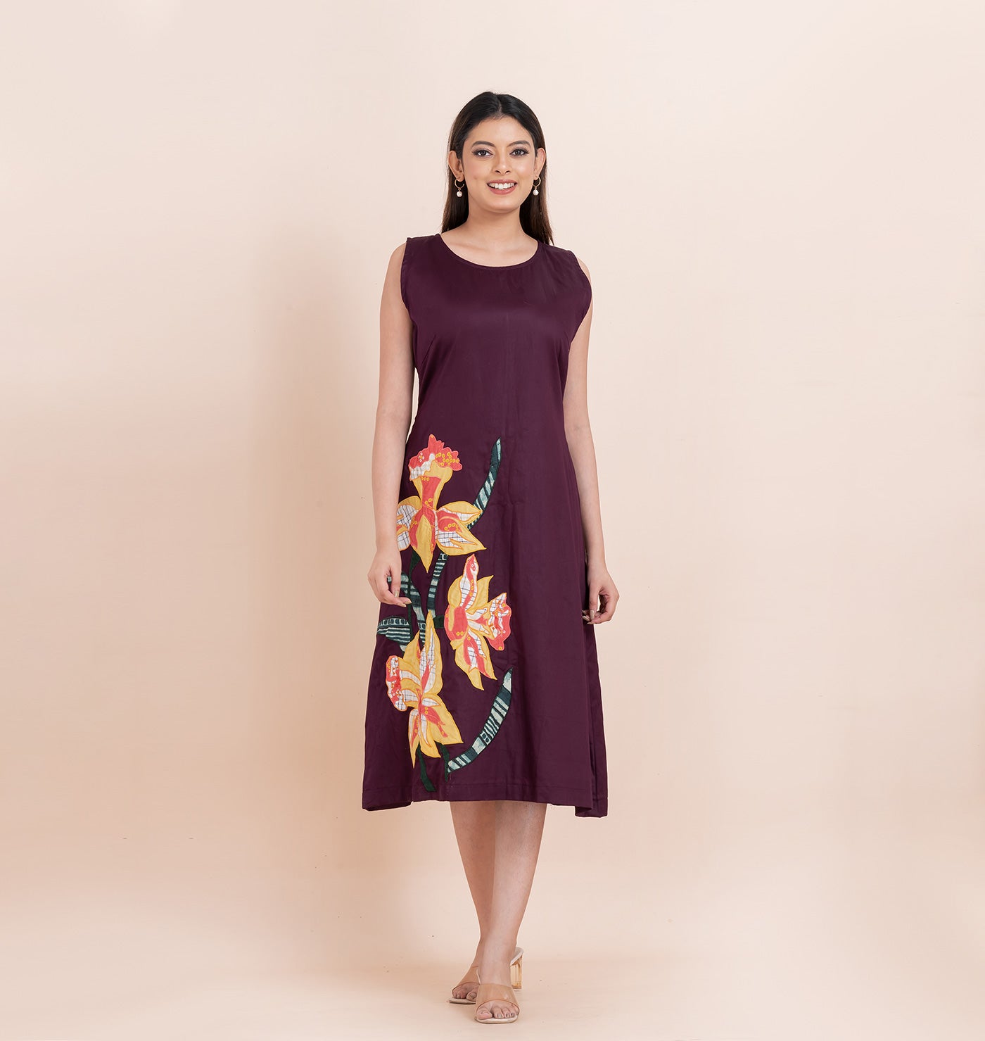 Sleeveless purple dress with an intricate handcrafted floral applique.