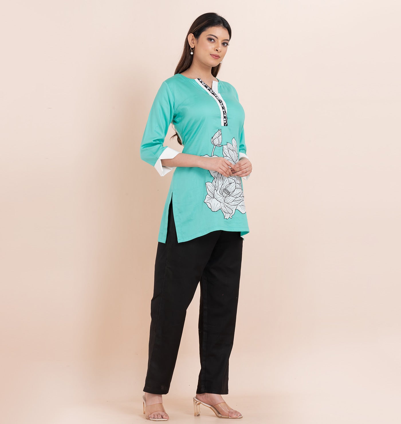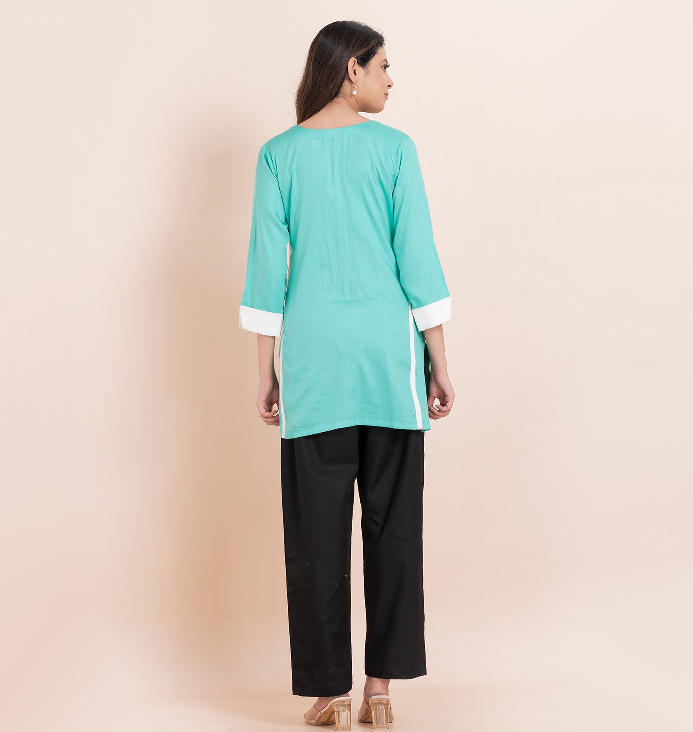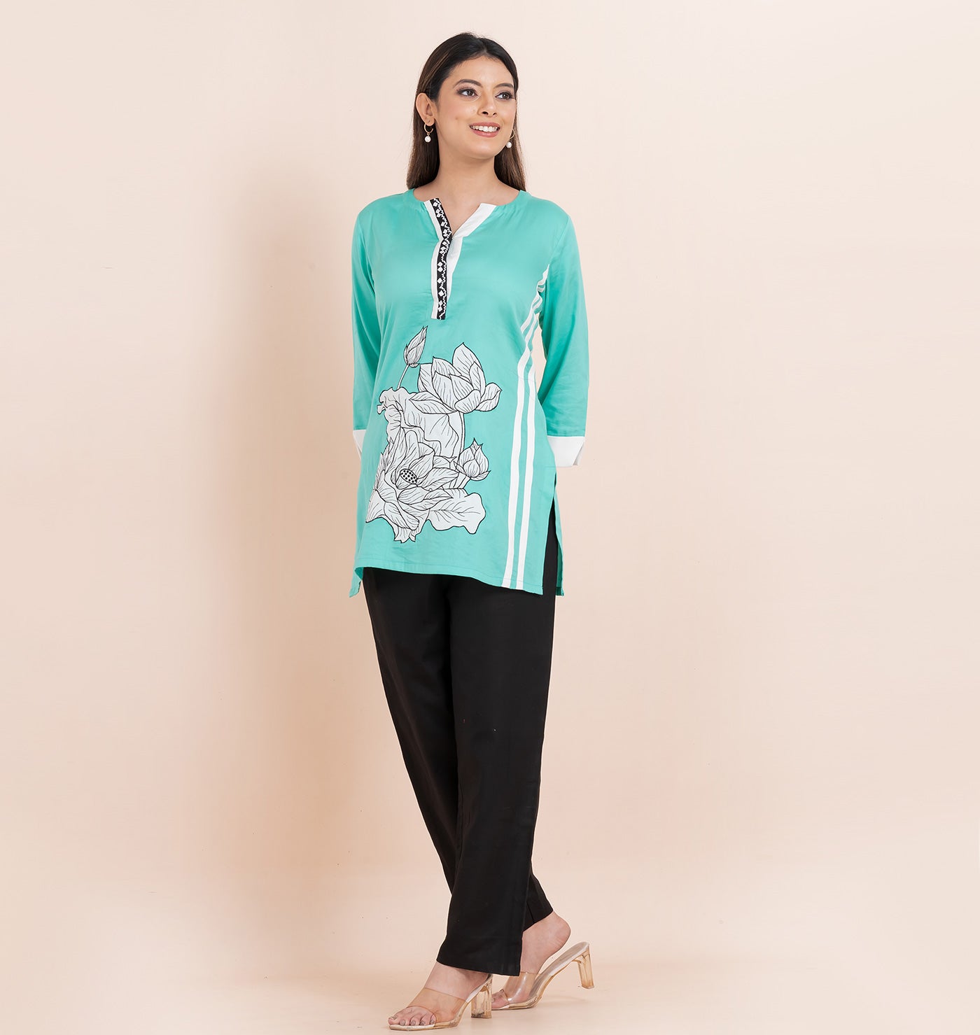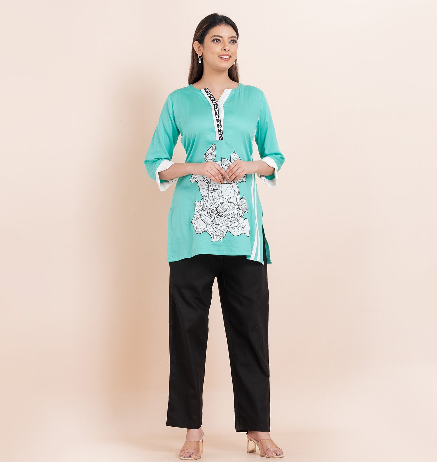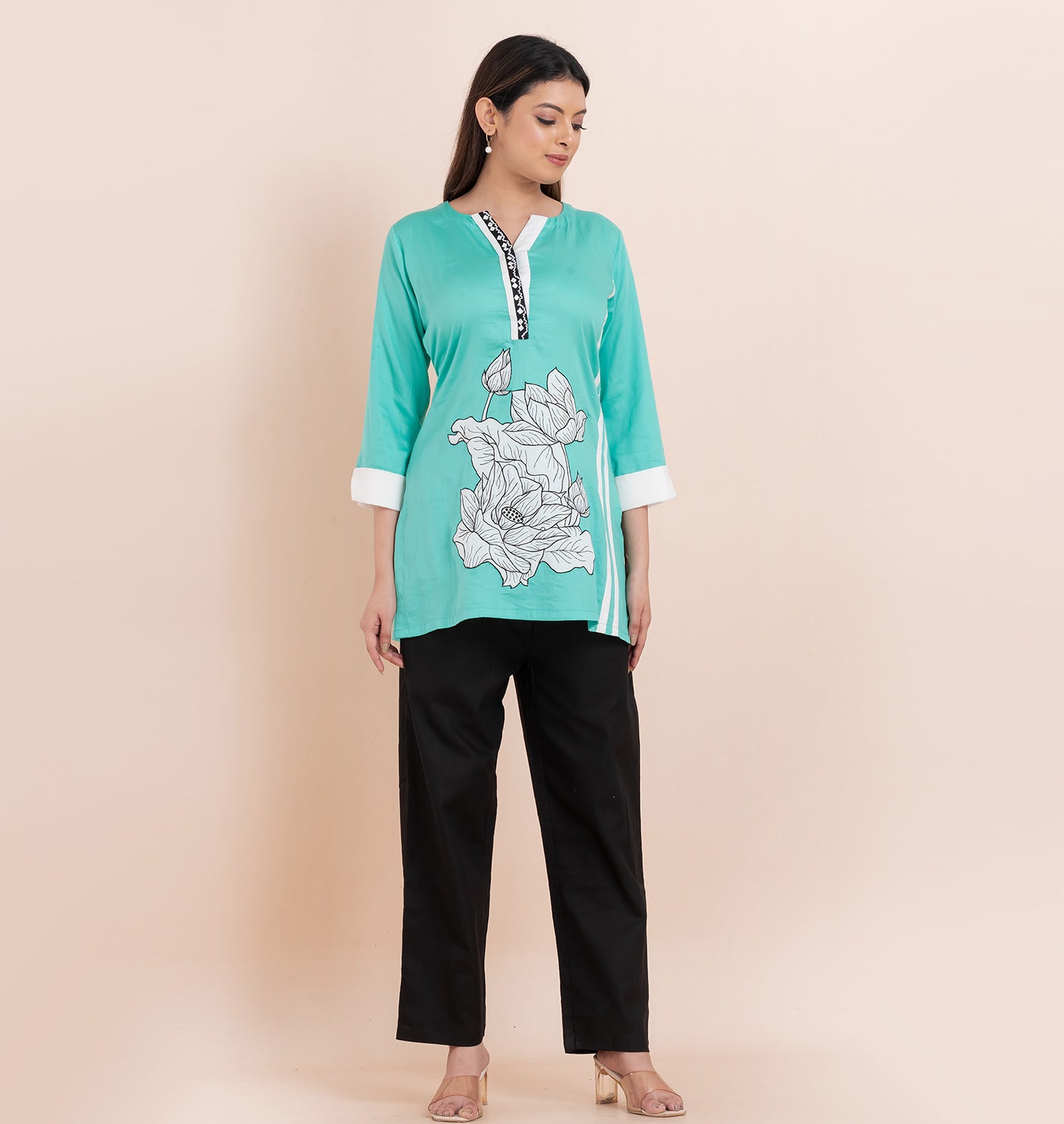 Elevate your everyday style with our SERENITY COORD SET, a perfect blend of elegance and contemporary design. Featuring delicate white floral appliqué on the front, this tunic adds a unique, modern twist to your wardrobe. The soft, earthy sage green hue offers a calming, sophisticated look, making it an easy choice for both daytime and evening events. The tunic is effortlessly paired with classic black pants, creating a versatile and stylish outfit that’s perfect for both casual and semi-formal occasions. Whether you're heading to the office, a casual day out, or an evening gathering, this set offers a chic, flattering look that will make you feel confident and comfortable all day long. This is the perfect go-to outfit for those who love to combine style, comfort, and versatility. Pair it with heels for a chic evening look or keep it casual with flats for a daytime outing, this set will quickly become a wardrobe essential.