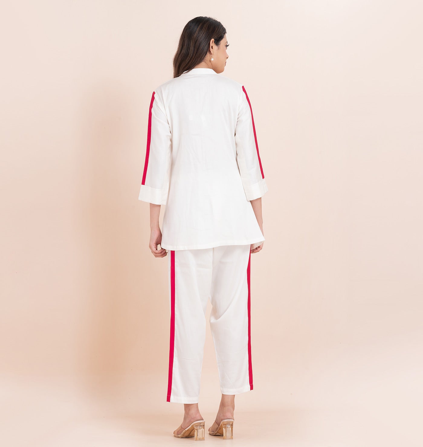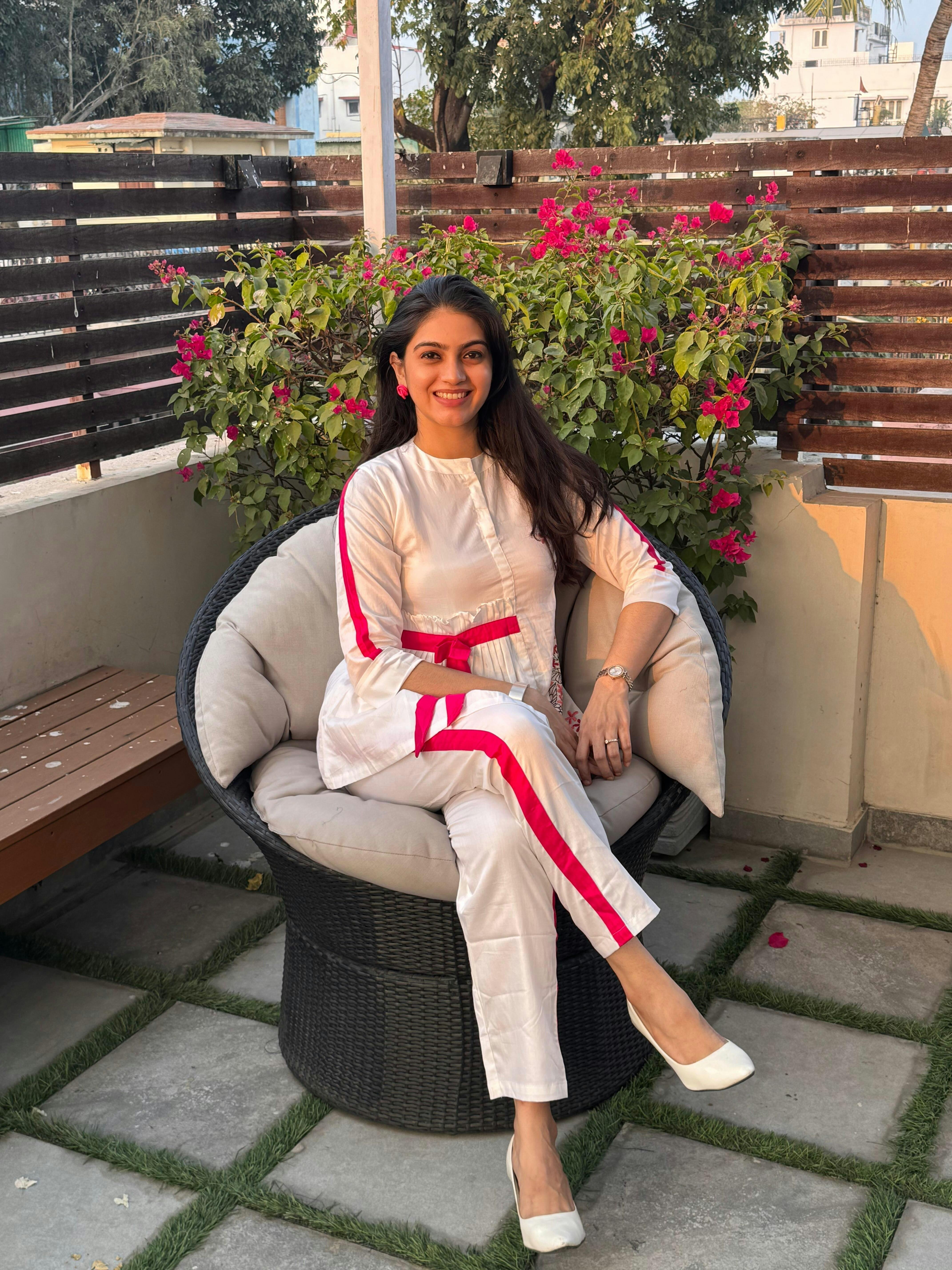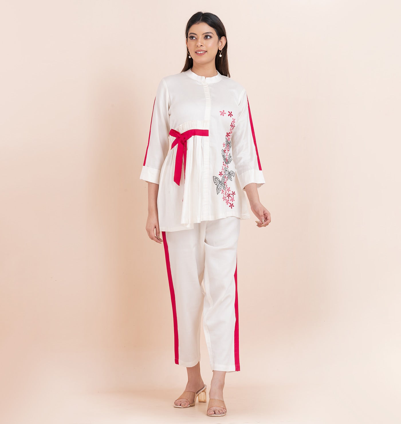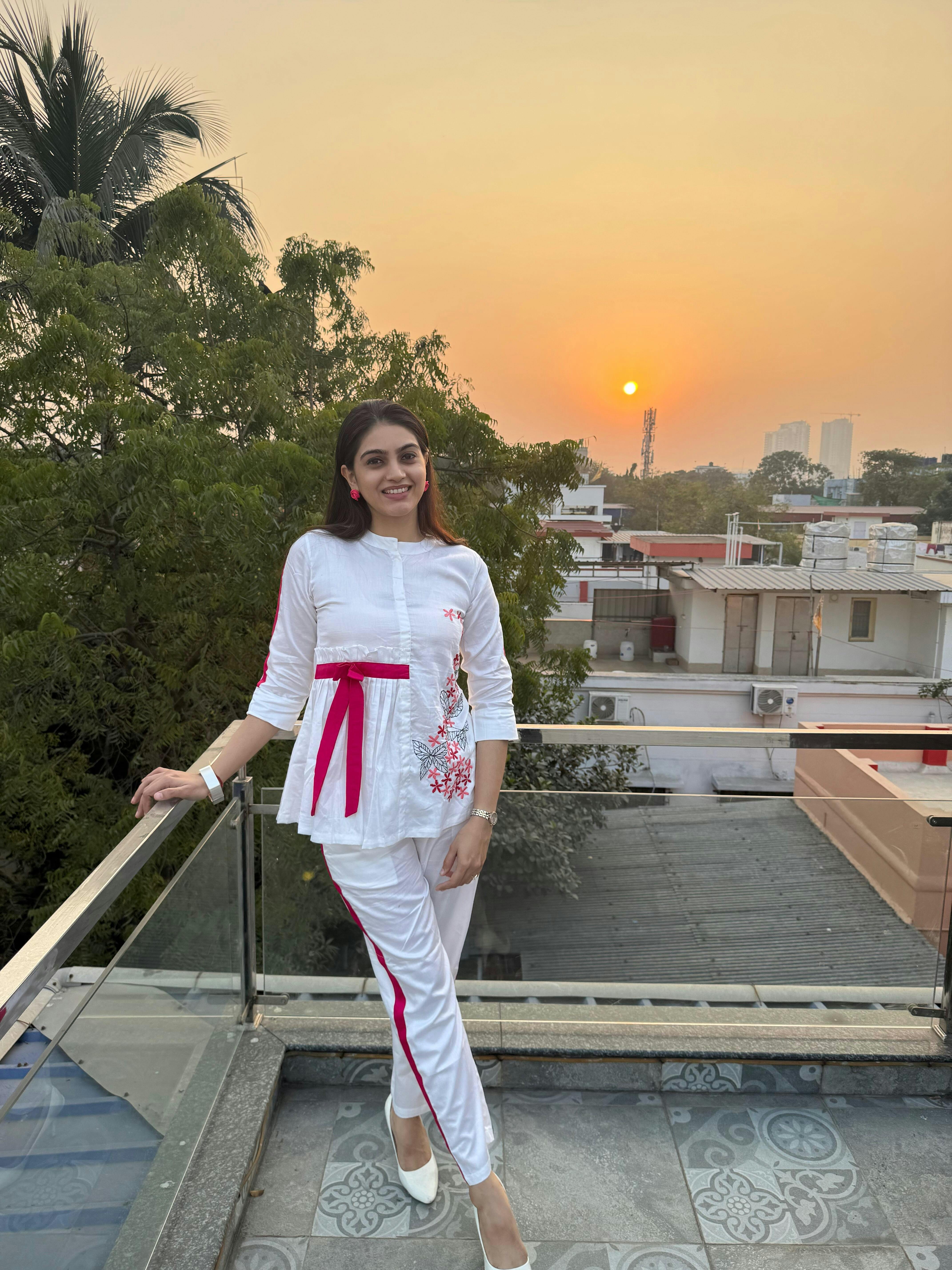Step into a world of delicate elegance with our Off-White SOFT ROSE AFFAIR Coord Set, designed for the modern woman who appreciates timeless beauty and intricate craftsmanship. This unique set features a shirt with butterfly and floral embroidery on one side, complemented by a playful pink bow detail and pink stripes running down the sleeves. The off-white pants with pink stripes running down the side hem create a cohesive, stylish look that’s perfect for any occasion. The pink accents — from the bow to the stripes — create a balanced pop of color, making the outfit chic yet understated. Ideal for pairing with minimalist accessories or adding a bold statement piece, this set offers endless styling possibilities. Whether you're attending a casual brunch, a day out with friends, or a semi-formal event, this coord set ensures you stand out with grace and sophistication.